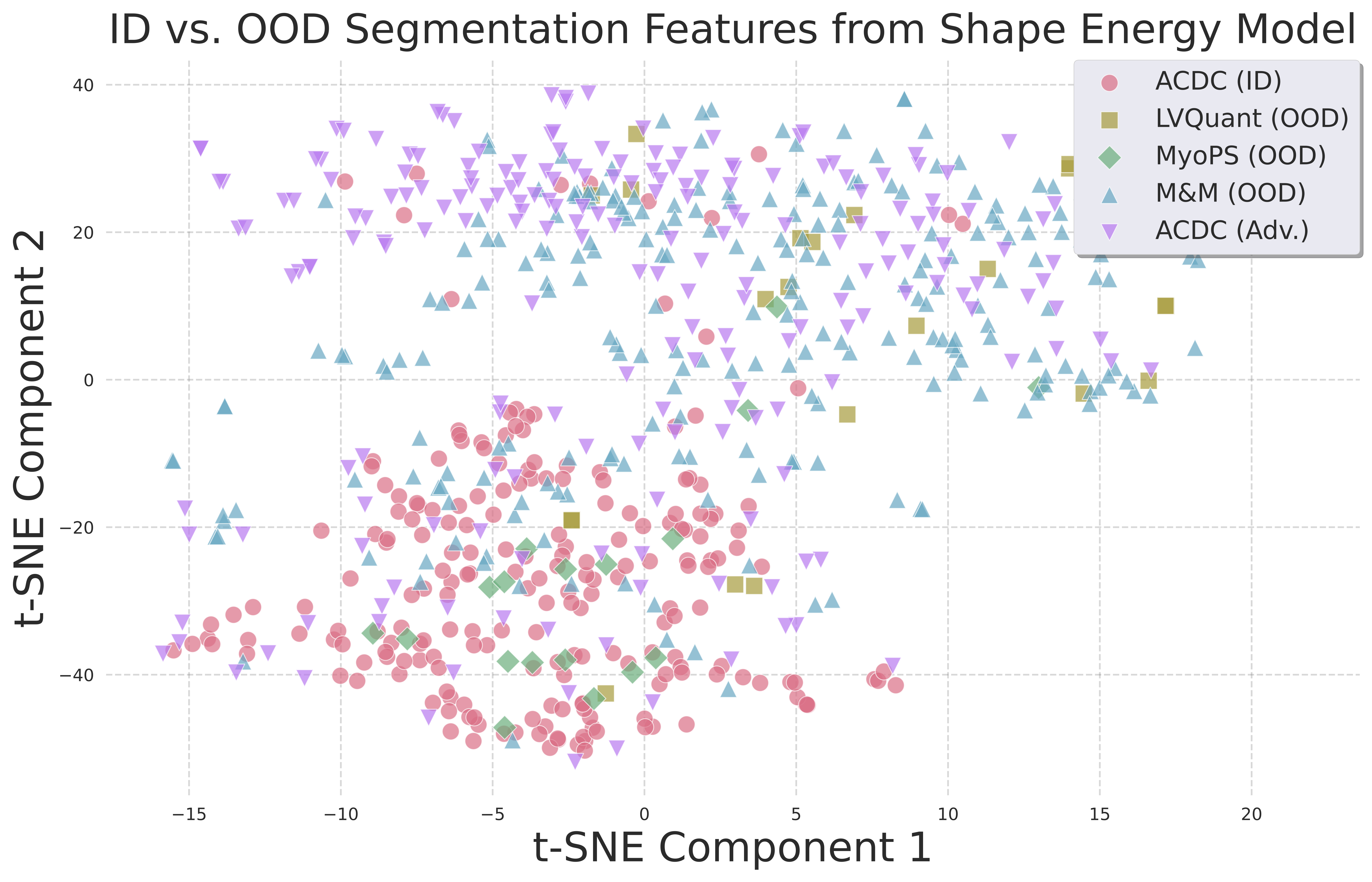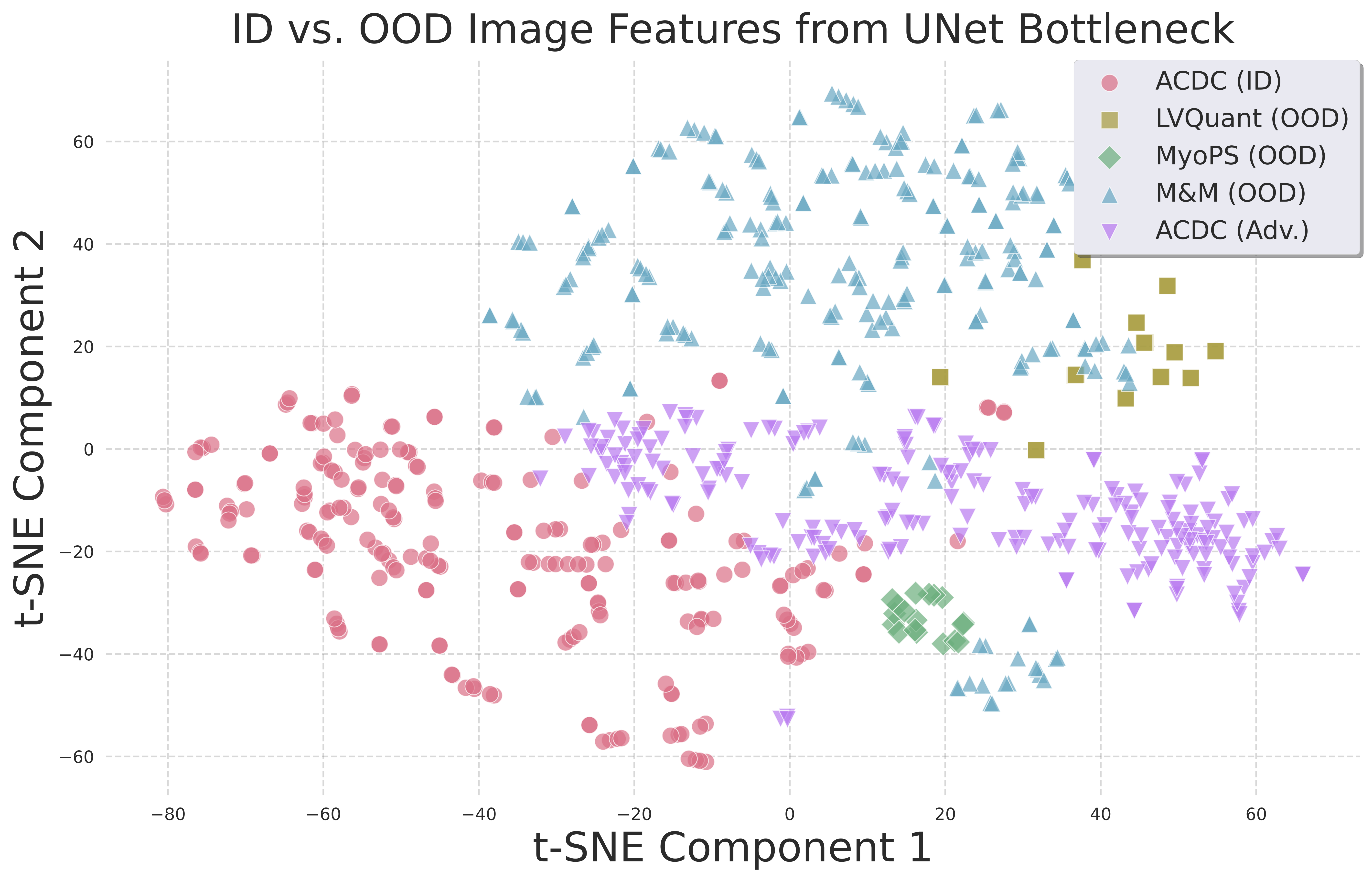 Our adversarial perturbation strategy produces images and segmentations that align with OOD cases, validating its effectiveness in modeling real covariate shifts.